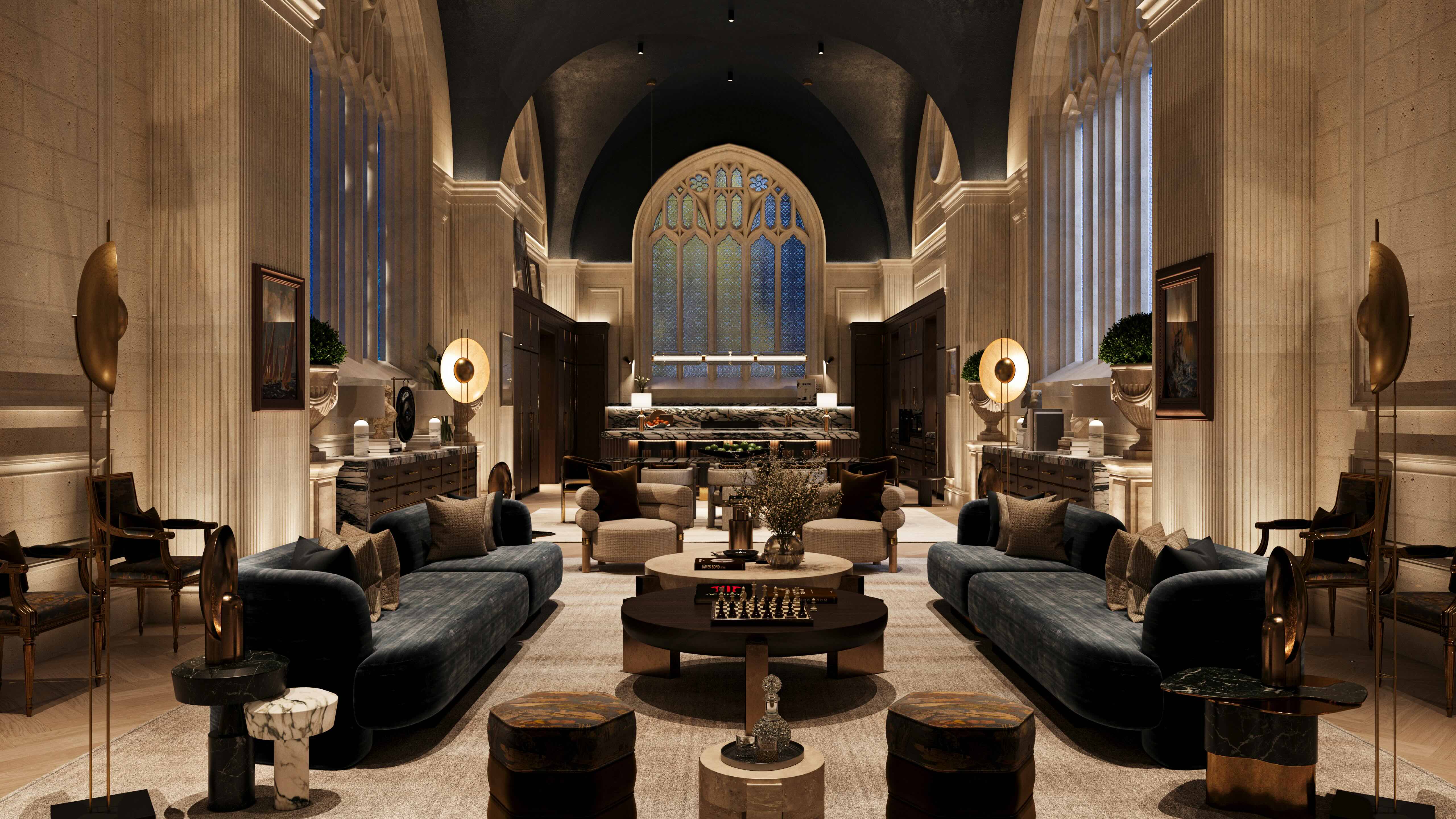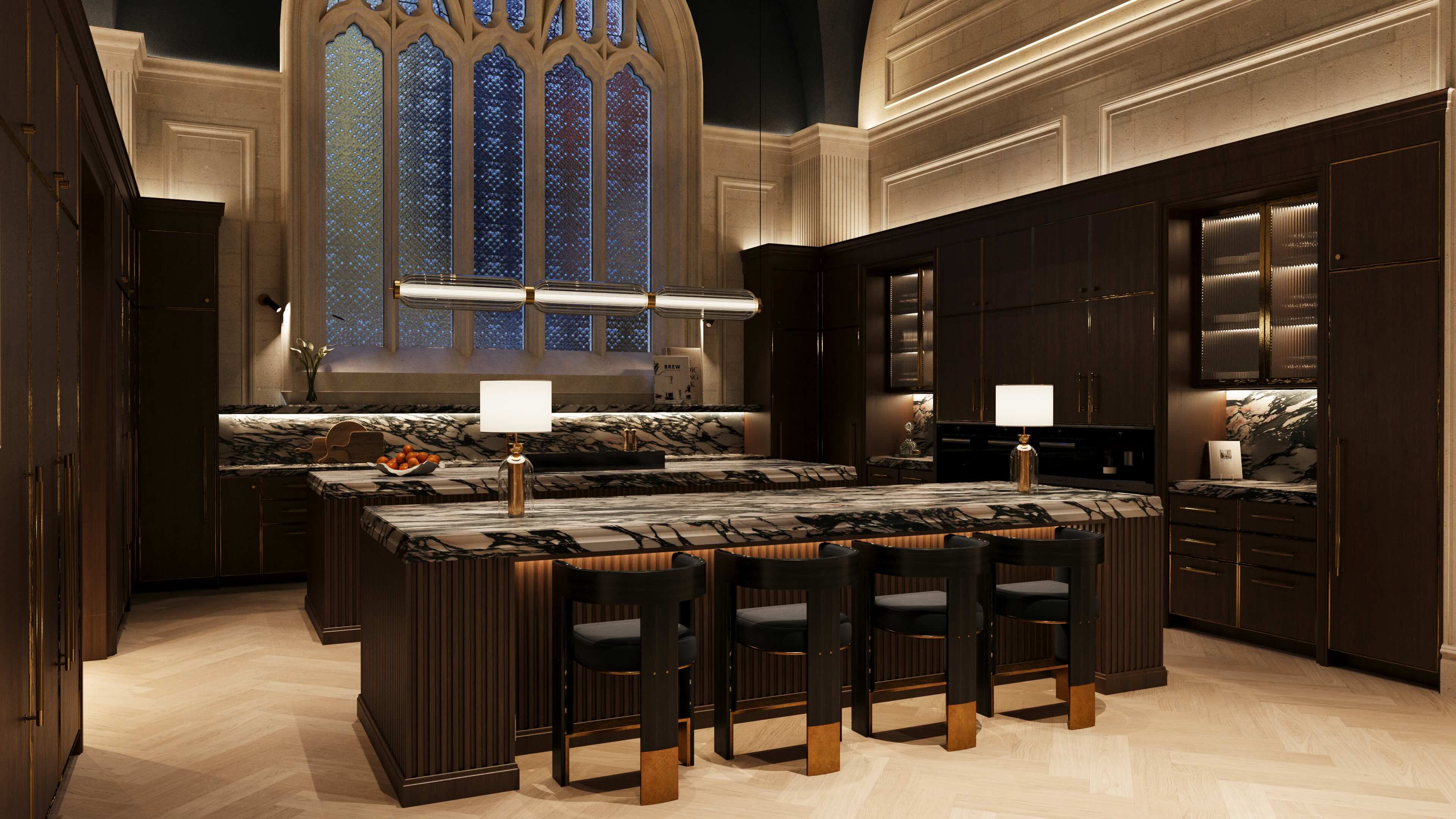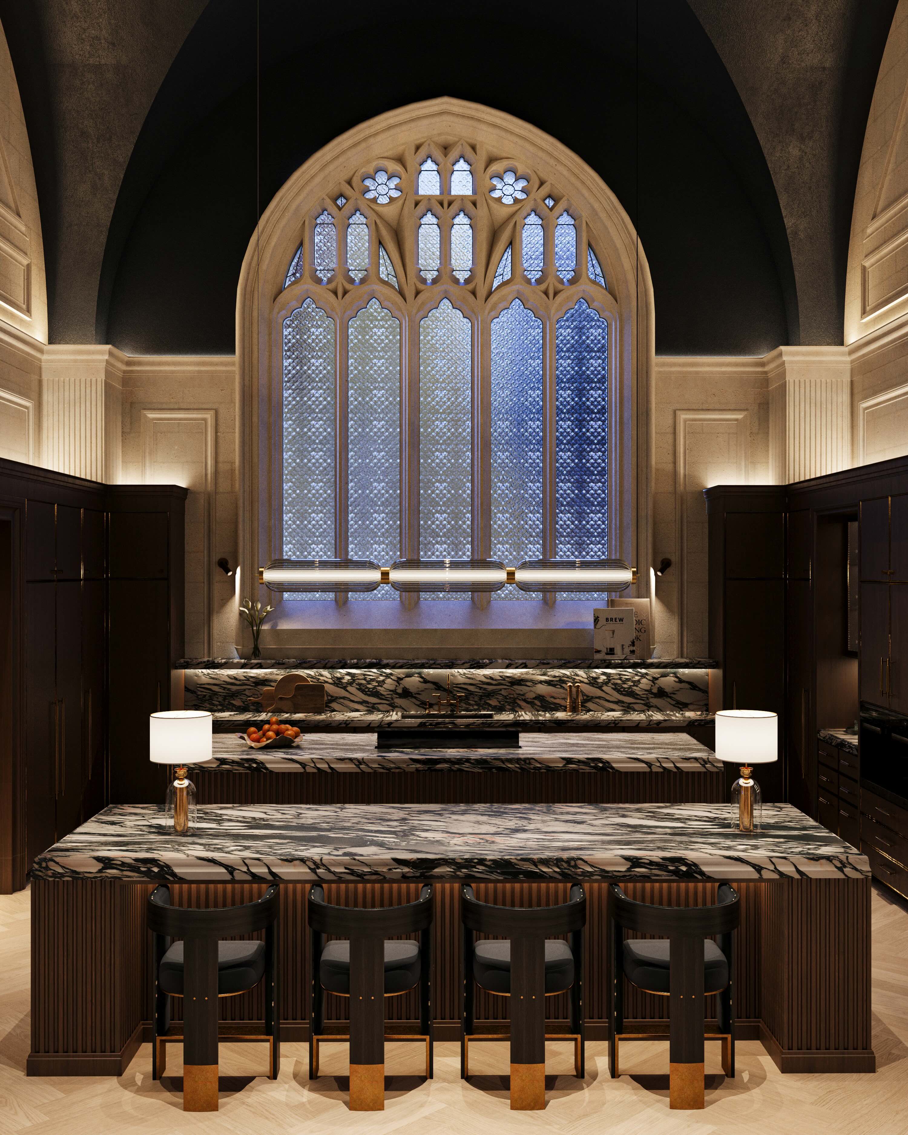 Full interior renovation of a historic church, transforming the space into a high-end, livable environment while preserving the original architecture. The design maintains key elements like the vaulted ceilings, stone detailing, and large stained glass window, integrating them with custom millwork, layered lighting, and modern furnishings. A new kitchen and living area are introduced within the existing volume, featuring rich wood cabinetry, stone surfaces, and tailored seating arrangements. The approach focused on respecting the scale and character of the building while adapting it into a functional residential space with a cohesive, elevated material palette.