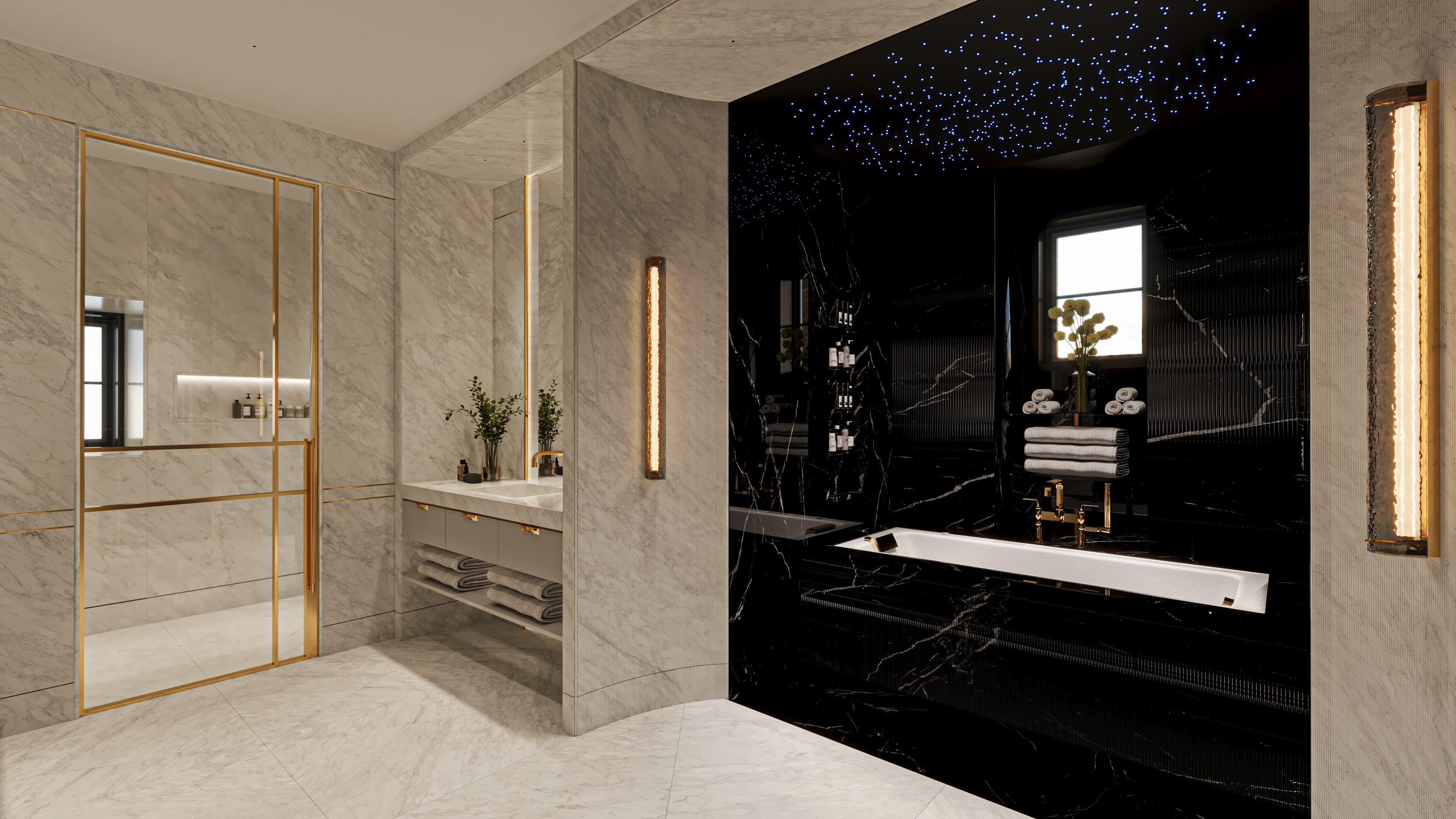 Full interior design of a private residence centered around a dark, high-contrast material palette and highly controlled lighting. The design integrates custom millwork, stone surfaces, and reflective finishes to create depth and detail throughout. A dedicated dressing area features illuminated display shelving and integrated storage, while the bedroom introduces a more immersive environment with layered lighting and a custom ceiling treatment. The layout prioritizes clean organization, concealed storage, and a strong sense of cohesion across spaces. The focus was on creating a refined, modern home with a bold, tailored aesthetic.